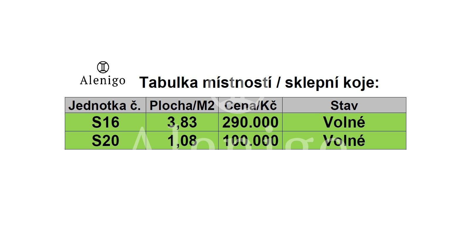 Celkem k prodeji 2 jednotky o velikostech od 1m2 a 3.83 m2 za ceny již od 100 000 Kč do 290 000 Kč.